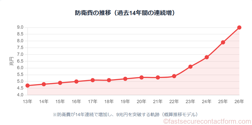 最新鋭のミサイルや、無人機、全国での弾薬庫建設など、一度決まれば数十年単位で維持費がかかり続ける「未来への固定費」です。
