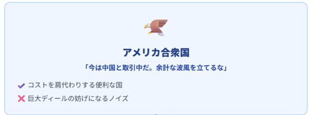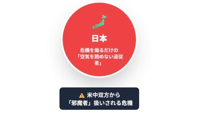 • 中国にとっての日本: アメリカと直接交渉して話がつくのであれば、日本の主張など一顧だにする必要もない。むしろ、アメリカを刺激し続け、地域の緊張を不必要に煽る日本を、取引の条件として「黙らせる」ようアメリカに求めるでしょう。