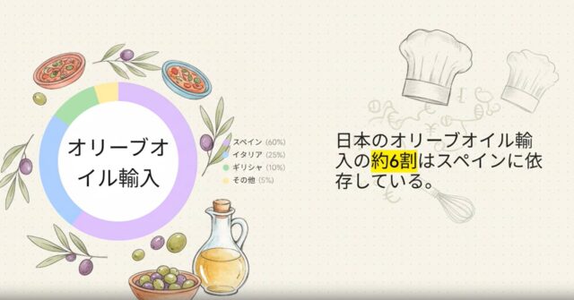 スペインは世界最大のオリーブオイル生産国であり、日本の輸入量の約6割を占めています。